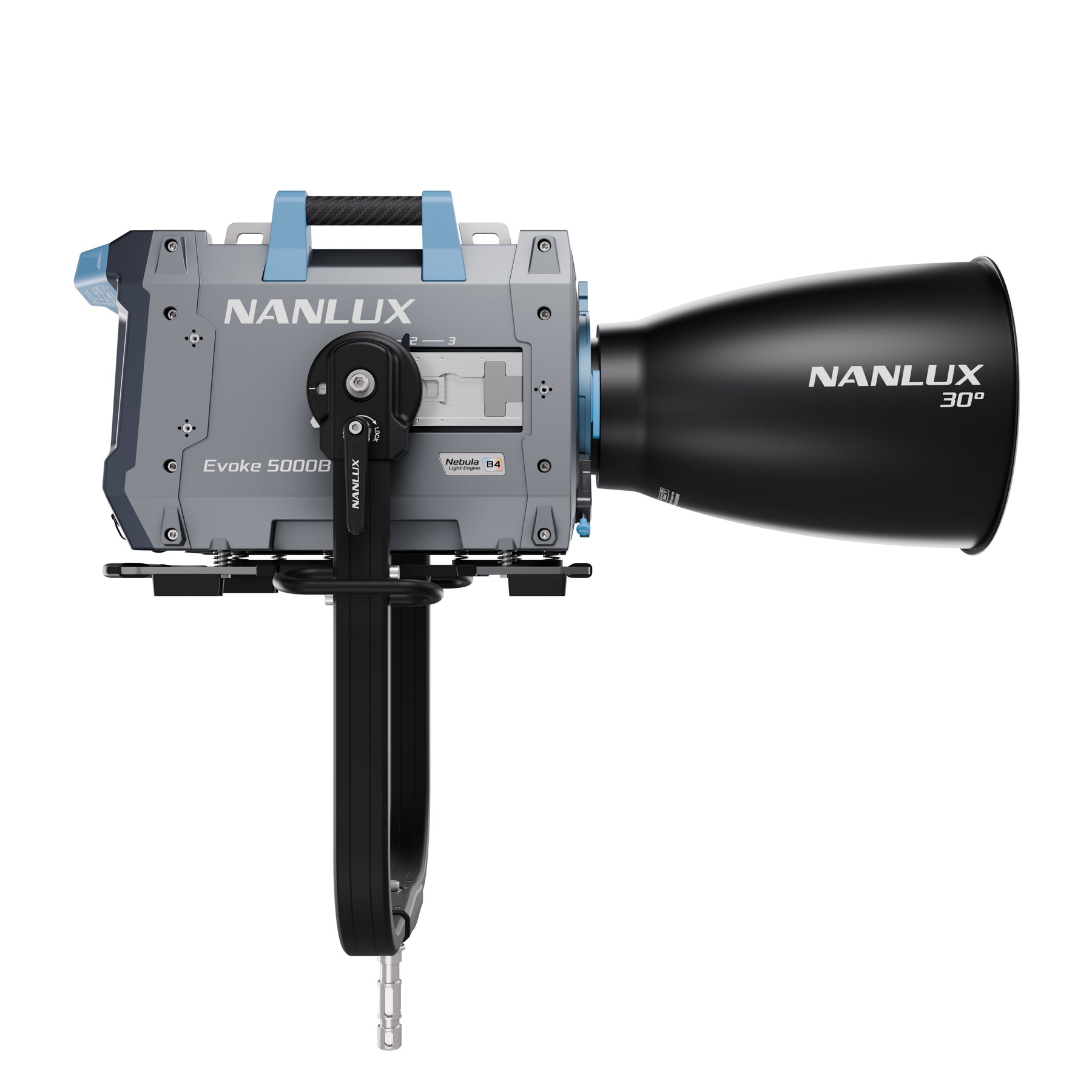 The NANLUX team has carefully considered users' diverse needs in the detailed design of the Evoke 5000B. It features balance-adjusting rails on both sides for flexible head positioning, maintaining a neutral center of gravity when different accessories are mounted. Its motorized yoke includes a disc brake for secure angle fixation and precise positioning, with an angle display ideal for group setups. The Evoke 5000B’s NL mount features the new PosiTight system, providing dual security to ensure a tighter connection between the fixture and the accessory.