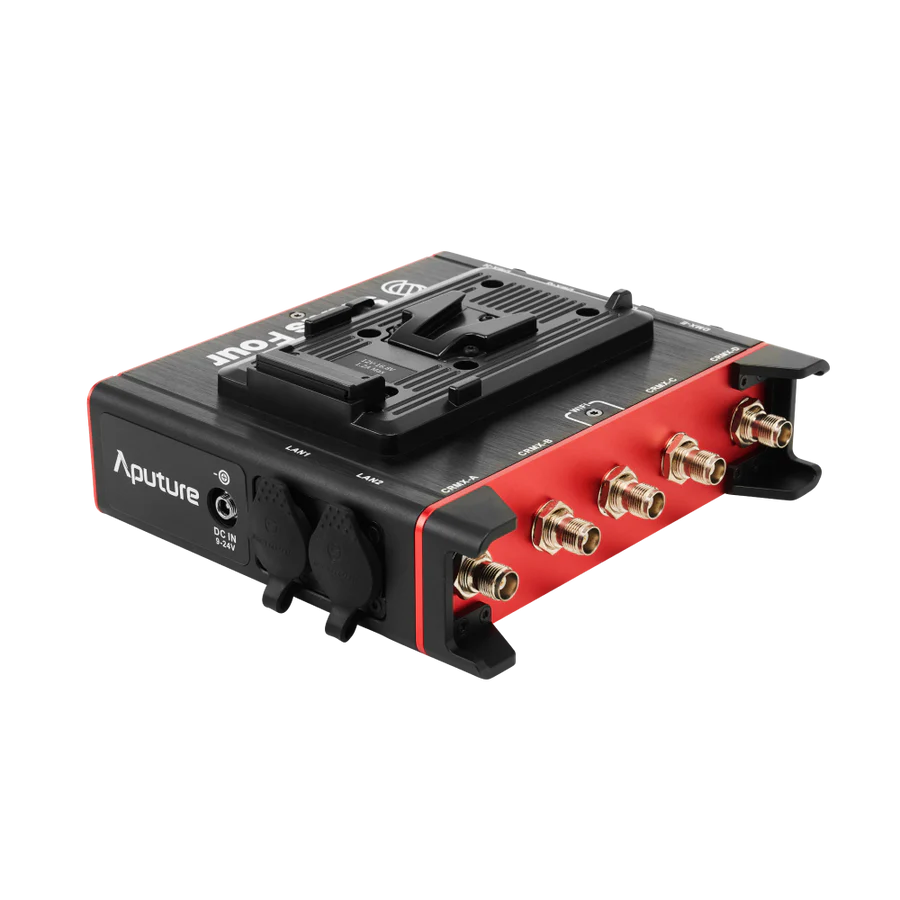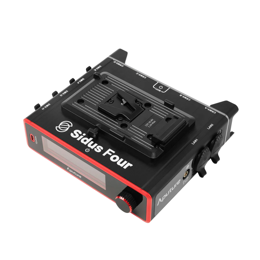 Transmit control via wired and wireless connections to up to 8 universes with the Sidus Four 4-Universe CRMX Transmitter from Aputure. The Sidus Four is a battery-powered transmitter that features four wired 5-pin DMX512 bidirectional ports and support for up to four wireless outputs using CRMX, DMX512, Sidus, Art-Net, and sACN protocols via Wi-Fi, Bluetooth, or Ethernet. The Sidus Four can be expanded to support even more universes.